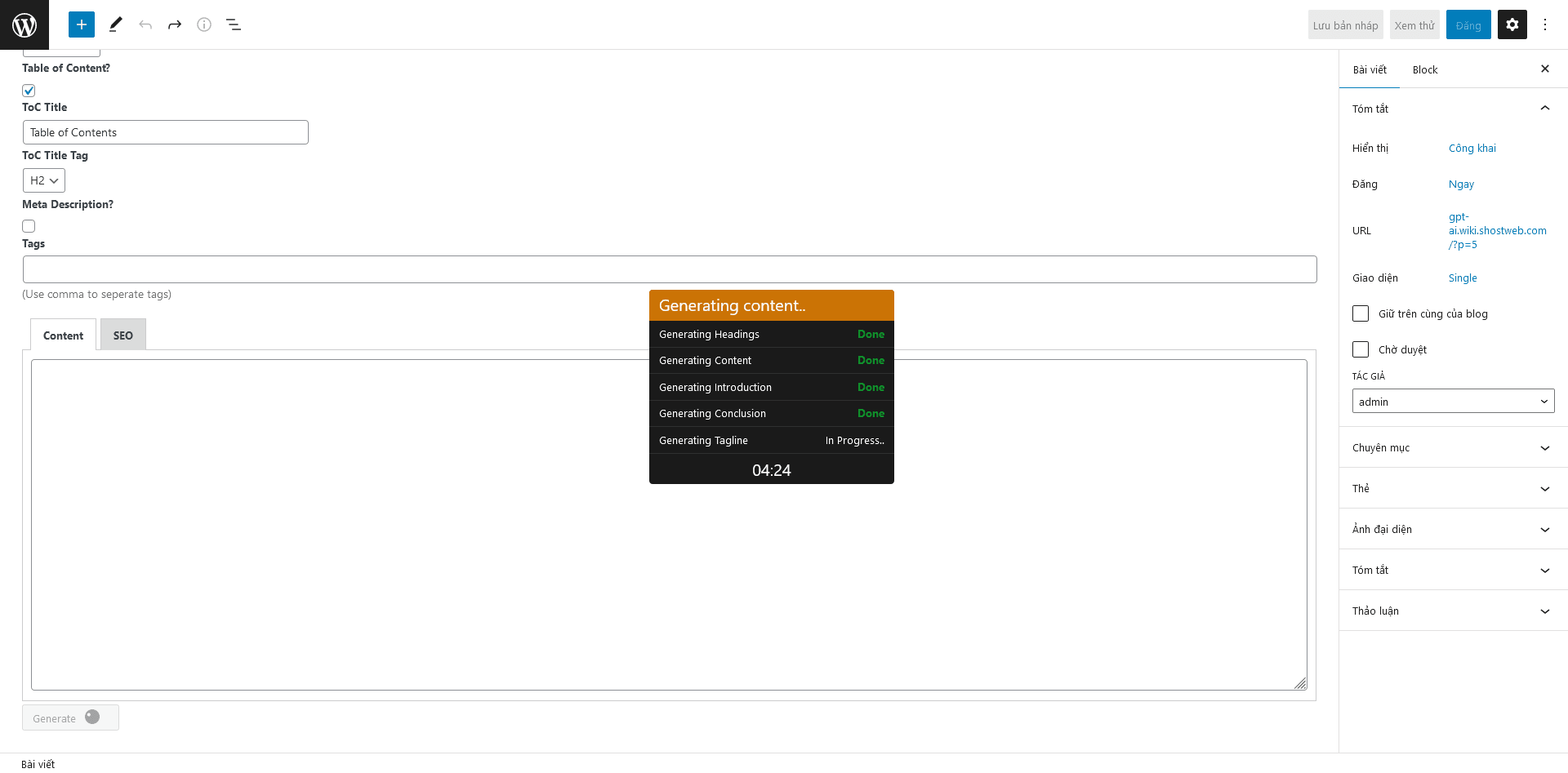 Tiếp theo, bạn cần điền thông tin cho bài viết, bao gồm tiêu đề, mô tả và từ khóa. Sau khi điền đầy đủ thông tin, hãy nhấn nút “Generate” để tạo nội dung tự động. Thời gian khoảng 2 đến 5 phút tuỳ vào điều kiện mạng, nội dung bài,…