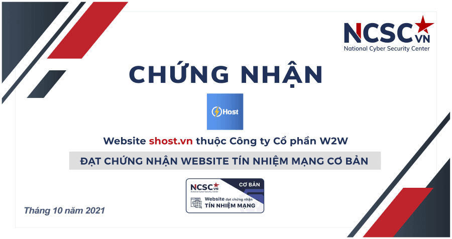 Trung tâm Giám sát an toàn không gian mạng quốc gia (NCSC) xác nhận website shost.vn của của Công Ty Cổ phần W2W đã hoàn thành quy trình đăng ký & kiểm duyệt tín nhiệm.