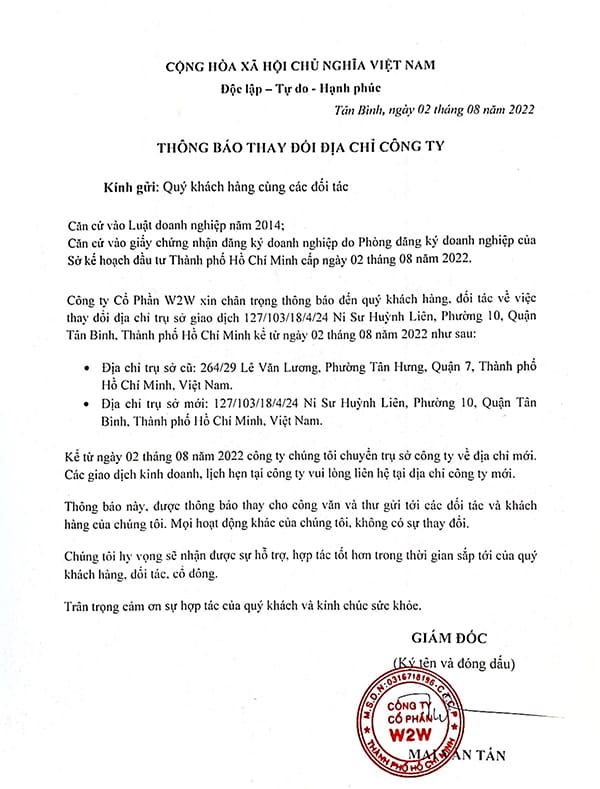 Công ty Cổ Phần W2W xin trân trọng thông báo đến quý khách hàng, đối tác về việc thay đổi địa chỉ trụ sở giao dịch 127/103/18/4/24 Ni Sư Huỳnh Liên, Phường 10, Quận Tân Bình, Thành phố Hồ Chí Minh kể từ ngày 02 tháng 08 năm 2022 như sau: